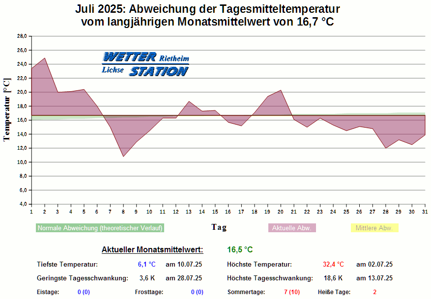 *************************************************** ************** T E M P E R A T U R ************** *************************************************** Mittlere Temperatur: 16,5 °C MIN Temperatur: 6,1 °C am 10.07.25 MAX Temperatur: 32,4 °C am 02.07.25 Mittlere MIN Temperatur: 11,5 °C Mittlere MAX Temperatur: 22,3 °C MIN Temp Delta : 3,6 K am 28.07.25 MAX Temp Delta : 18,6 K am 13.07.25 Mittl. Temp Delta: 10,9 K Starkfrosttage : 0 Eistage : 0 Frosttage : 0 Sommertage : 7 Heiße Tage : 2 *************************************************** ************ N I E D E R S C H L A G ************ *************************************************** Ges. Niederschlagsmenge: 120,6 mm MAX Niederschlag/Stunde: 14,0 mm am 27.07.25 MAX Niederschlag/Tag: 40,4 mm am 27.07.25 MAX Niederschlag in 24h: 40,4 mm am 27.07.25 MAX Niederschlag Rate: 145,8 mm/h am 14.07.25 Niederschlag an 21 Tagen Regentage (> 1mm) : 12 Regentage (> 3mm) : 10 Regentage (> 10mm) : 3 Regentage (> 20mm) : 1 *************************************************** ******************** W I N D ******************** *************************************************** Mittlere Windgeschwindigkeit: 0,7 m/s = 2,6 km/h Effektive Windrichtung: NW Maximale Windgeschwindigkeit: 11,6 m/s = 41,8 km/h aus S am 14.07.25 Prozentuale Verteilung Windgeschwindigkeit: Bft_0 (bis 0,9 km/h) : 35.20 % Bft_1 (bis 5,6 km/h) : 50.87 % Bft_2 (bis 12 km/h) : 13.78 % Bft_3 (bis 20 km/h) : 0.15 % Prozentuale Verteilung Windrichtung: N : 19.1 % NNO : 5.3 % NO : 4.7 % ONO : 0.7 % O : 0.7 % OSO : 5.0 % SO : 0.5 % SSO : 0.5 % S : 4.3 % SSW : 15.3 % SW : 3.2 % WSW : 3.6 % W : 2.3 % WNW : 10.7 % NW : 8.8 % NNW : 15.4 % *************************************************** *************** L U F T D R U C K *************** *************************************************** Mittlerer Luftdruck: 1013,9 hPa MIN Luftdruck: 1002,9 hPa am 20.07.25 MAX Luftdruck: 1023,6 hPa am 04.07.25 *************************************************** ************ L U F T F E U C H T E ************** *************************************************** Mittlere rel. Luftfeuchte: 77,7 % MIN rel. Luftfeuchte: 22,0 % am 05.07.25 MAX rel. Luftfeuchte: 98,0 %