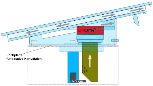 Da ich nun eine wartungsfreundliche, robuste und wetterfeste Lösung anstrebte, habe ich mich entschlössen, keine lamellenbasierte, rundherum offene Klimahütte mehr zu bauen, sondern ein permanent belüftetes, einem senkrechten Rohr vergleichbares Sensorgehäuse, was deutlich einfacher zu bauen ist. Für mich war dabei wichtig, daß ich bei dieser auf permanente Belüftung ausgelegten Konstruktion auch im Fall eines Lüfterausfalls (der Strom kann immer mal ausfallen) noch relativ gute Messwerte erhalte. Daher sollte mein Sensorgehäuse mit einem "Bypass" für passive Konvektion, einem zusätzlichen, nach unten und nach Norden komplett offenen extenen Strahlenschutz und einer Notstromversorgung mit Solarstrom ausgestattet sein. Zur Verdeutlichung mag diese Zeichnung dienen. Das Sensorgehäuse wird bei dieser Konstruktion praktisch nie direkt vom Sonnenlicht bestrahlt und reagiert durch den permanenten Luftstrom sehr schnell auf Temperaturänderungen. Eine Seite des Gehäuses kann heruntergeklappt und die Sensoreinheit mit einem Handgriff gewechselt werden. Auch der Lüfter kann mit einem Handgriff ausgetauscht werden. Er braucht in der verwendeten Konstruktion nur mit sehr geringer Drehzahl betrieben werden, was beim Einsatz eines dafür geeigneten Lüfters die Lebensdauer stark erhöht. Zur Energieversorgung reicht ein kleiner 1,5 Watt Blocktrafo. Ein Leerrohr für elektrische Kabel vom Haus zur Station brauche ich ohnehin: Zum Einen da ich nun eine Kabelversion betreibe und zum Anderen für die Energieversorgung der Regenmesserheizung.
