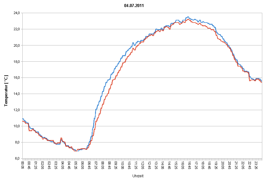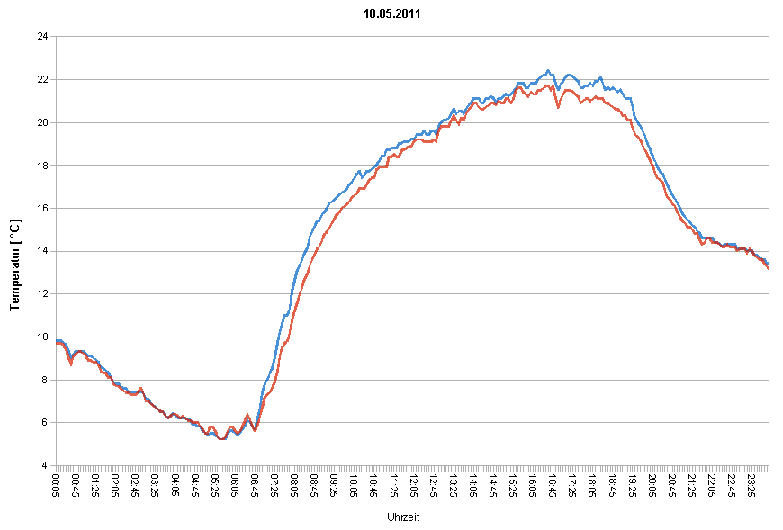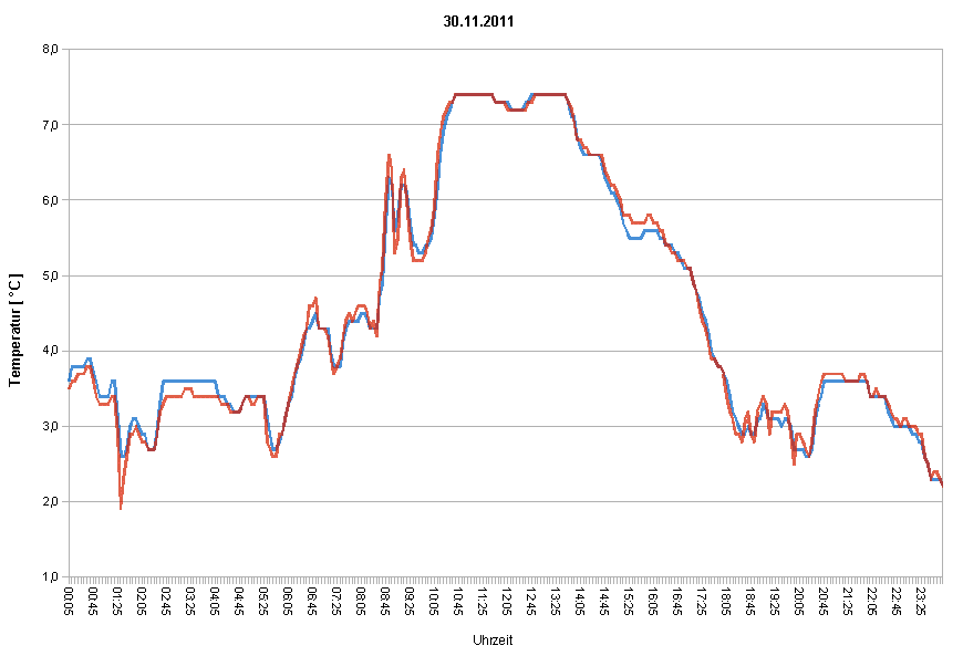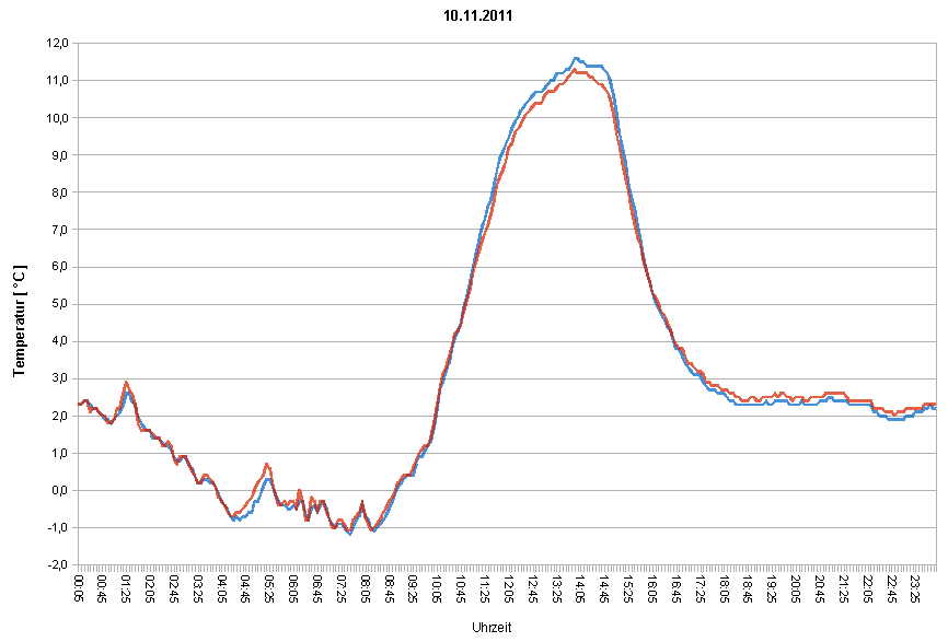 Das Beispiel aus dem Oktober zeigt den typischen Verlauf eines Tages ohne nennenswerten Sonnenschein, es sind praktisch keine Abweichungen im Temperaturverlauf erkennbar.