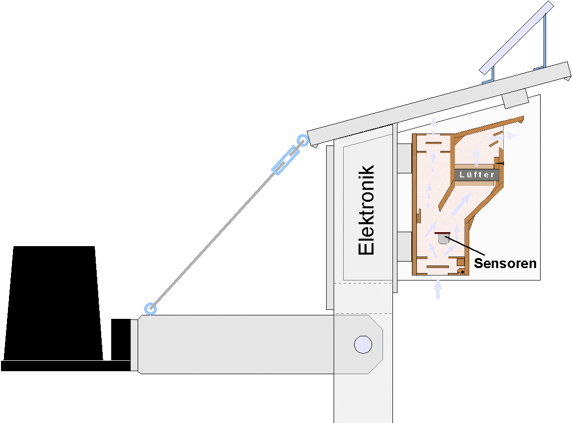 In die Elektronik in der WS ist auch ein Solarpanel integriert, damit der Lüfter des Sensorgehäuses bei einem Stromausfall zumindest bei Sonnenschein weiterläuft. Die Spannung für diesen Lüfter ist elektronisch stabilisiert. Die Heizung selbst ist im Falle eines Stromausfalls natürlich außer Betrieb.